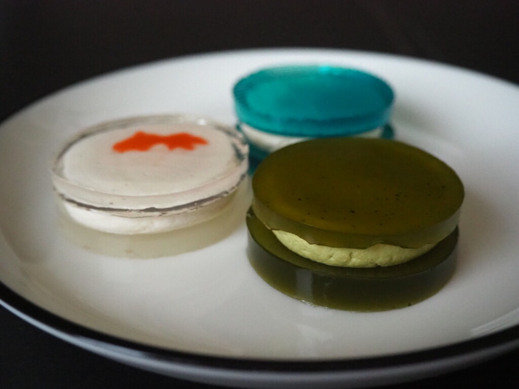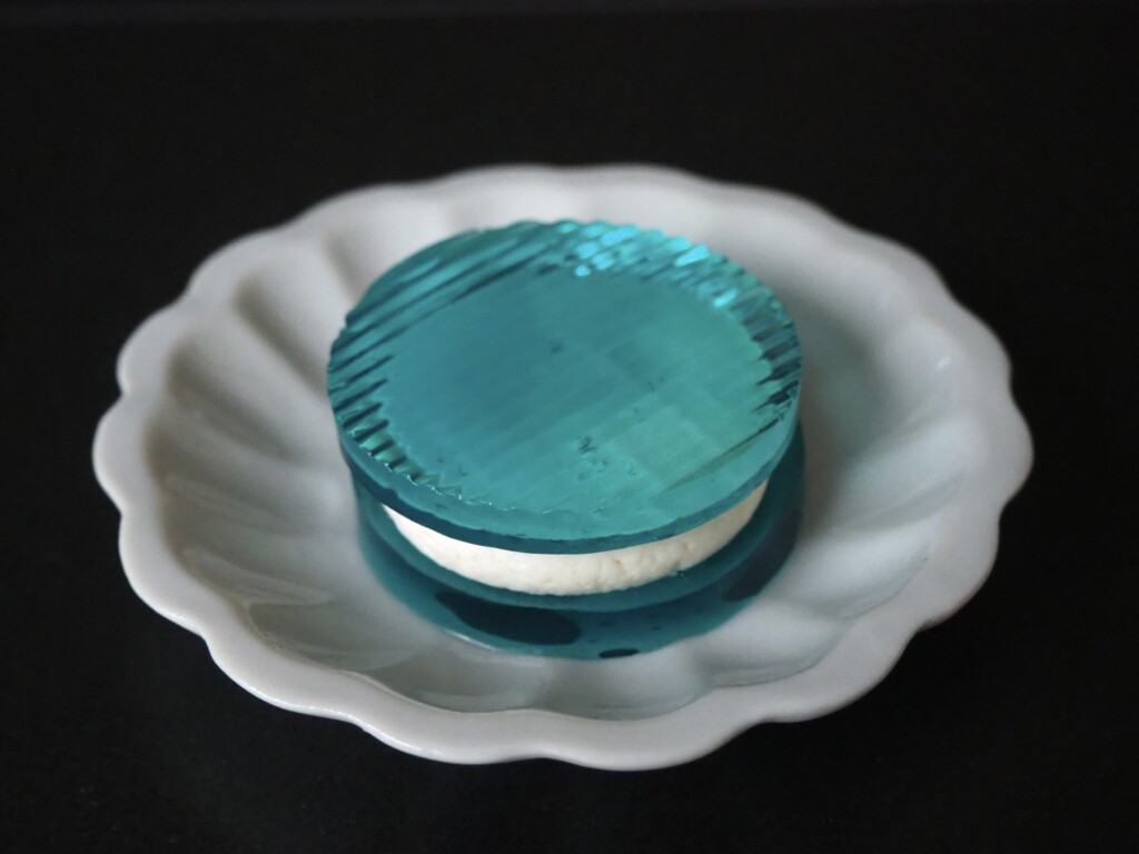 まずはブルーが涼しげな「夜の海、水面にほどける月の影」を実食。プルンとしたゼリーのようなものは、錦玉(きんぎょく)と呼ばれる和菓子の伝統技術だそうです。