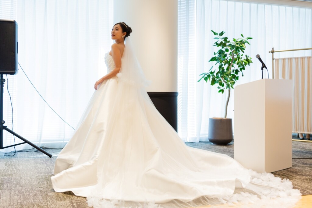2メートルのバックトレーンが、チャペルのスケールにふさわしい迫力を添え、ドレス単体でも華やかに映える仕上がりに。