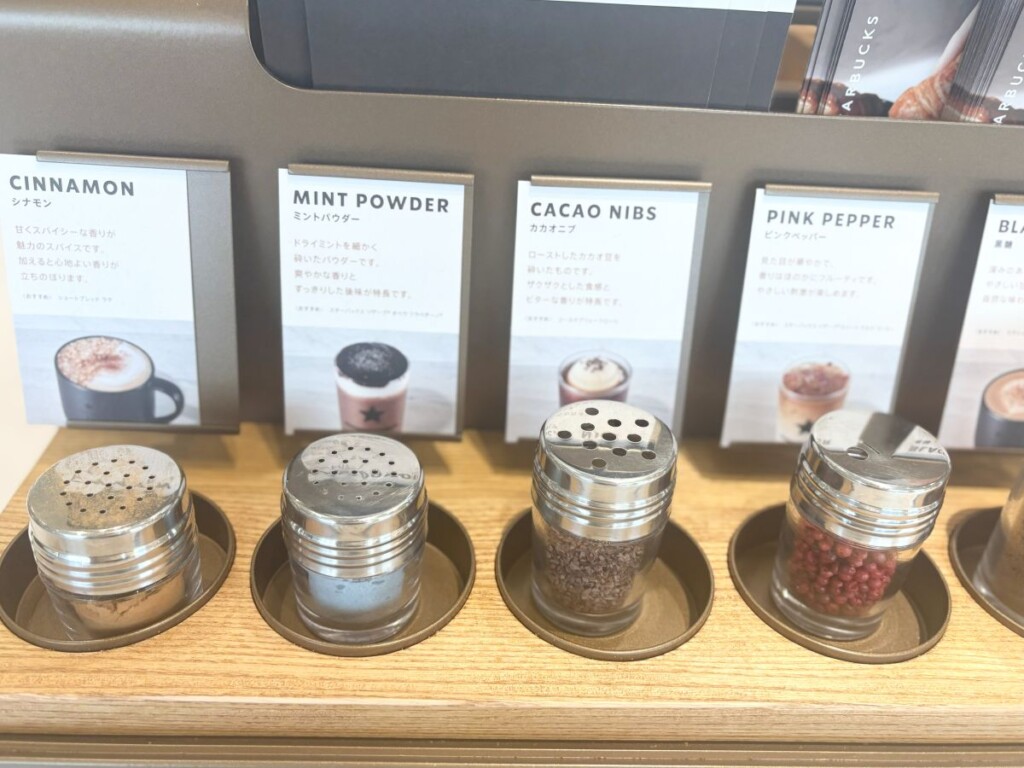 6種類(シナモン・ミントパウダー・カカオニア・ピンクペッパー・黒糖・アガベシロップ)のフレーバーがカウンターに用意されており、好みに合わせてアレンジを楽しむことができます。