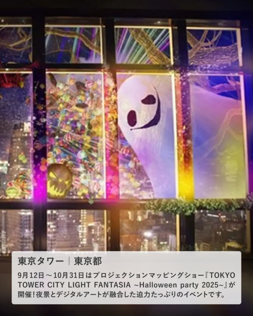 紅葉やススキといった風情ある秋の風景から、オバケたちが登場する賑やかなハロウィンの演出へ。東京都の夜景と一緒に楽しめる、没入型のイベントです。
