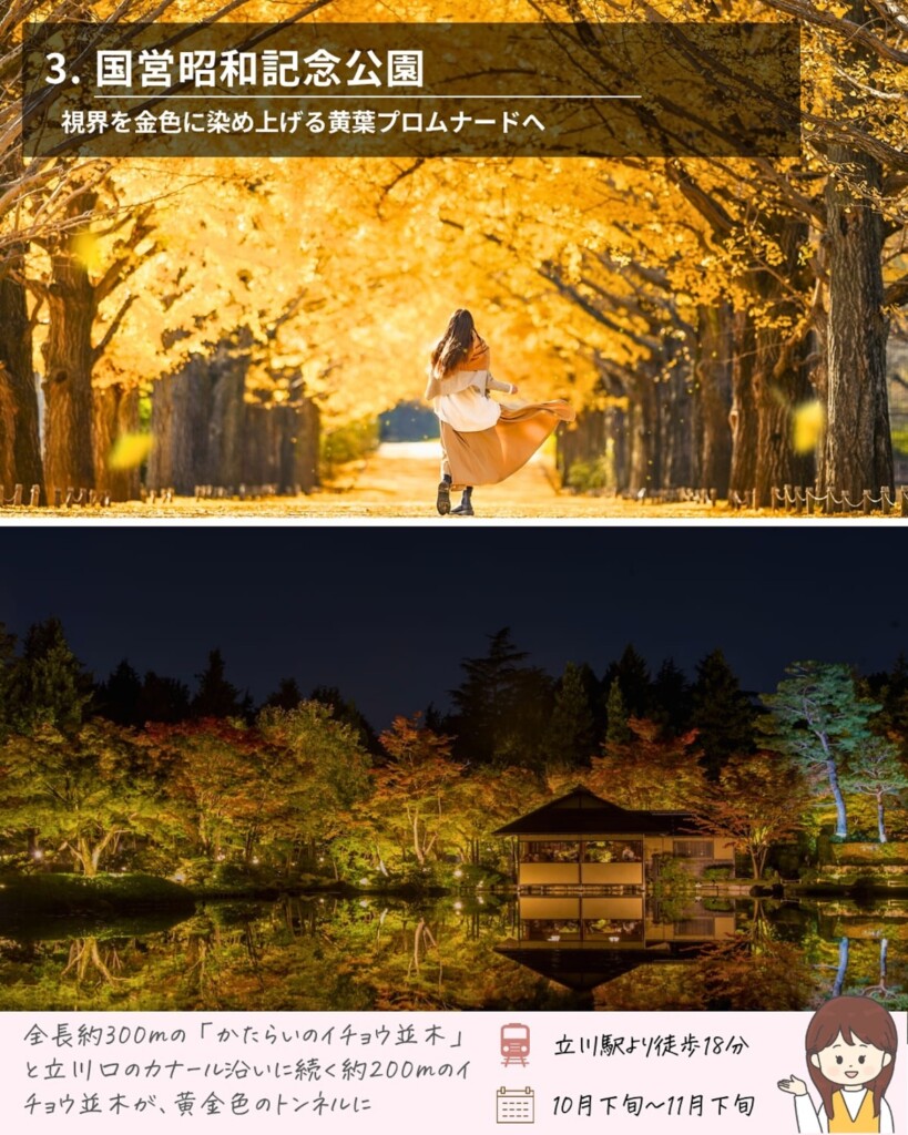 秋は全長300mの「かたらいのイチョウ並木」や、「カナール」の黄葉、日本庭園のモミジなどを見ることができます。夜間のライトアップも行なわれるので、昼と夜どちらも散策してみたいですね。
