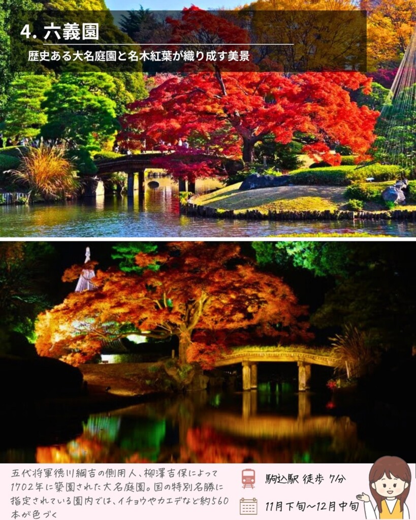 文京区にある六義園(りくぎえん)は、1702年に造られた歴史ある庭園です。都内有数の紅葉の名所として知られ、秋限定で夜間の特別開園も行なわれます。夜はライトアップや土蔵へのプロジェクションマッピングがあり、幻想的な風景を楽しめるでしょう。