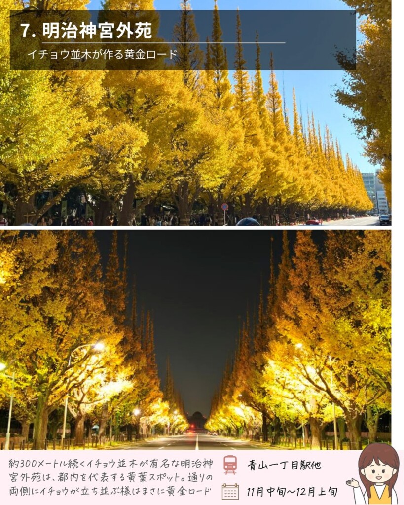 146本のイチョウの木がおよそ9mの間隔で植えられ、11月中旬から下旬にかけて並木道が黄金に染まります。聖徳記念絵画館から青山口に向かって下り坂になっており、奥まで続く黄金のトンネルは壮観です。