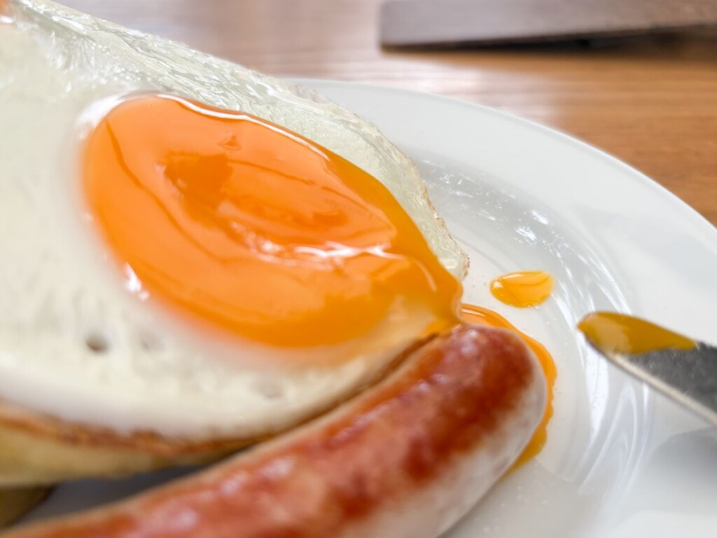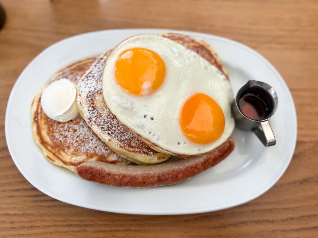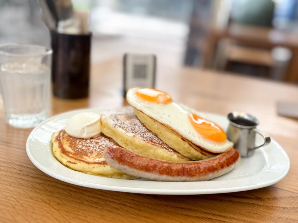 厚みのあるパンケーキ3枚に、ビッグサイズのソーセージと目玉焼きが付いています。