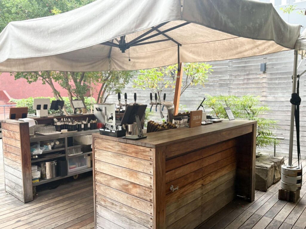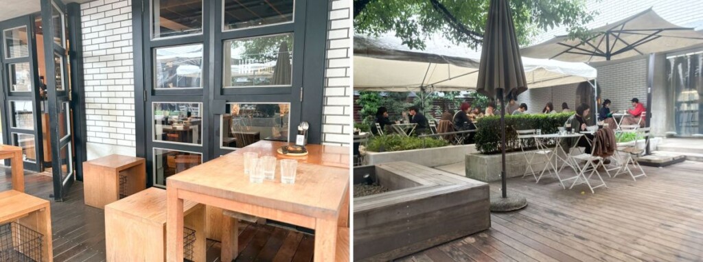 店内は木のテーブルと椅子でインダストリアルかつモダンな雰囲気。天気が良い日は開放感のあるテラス席も人気です。