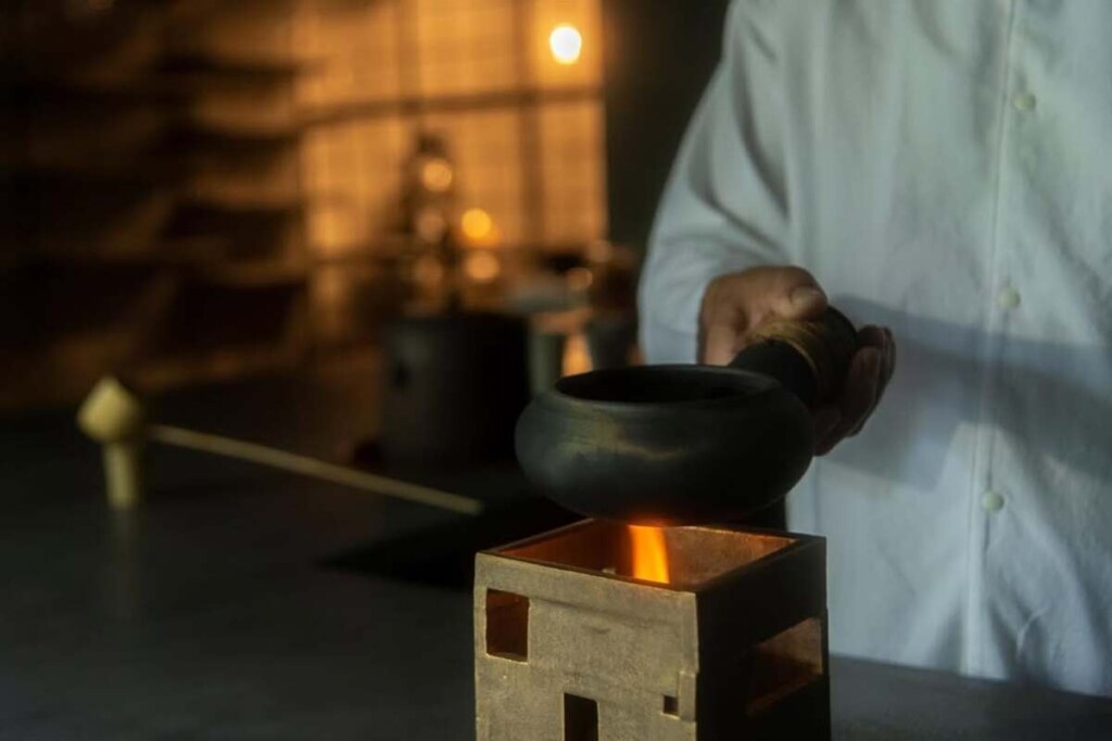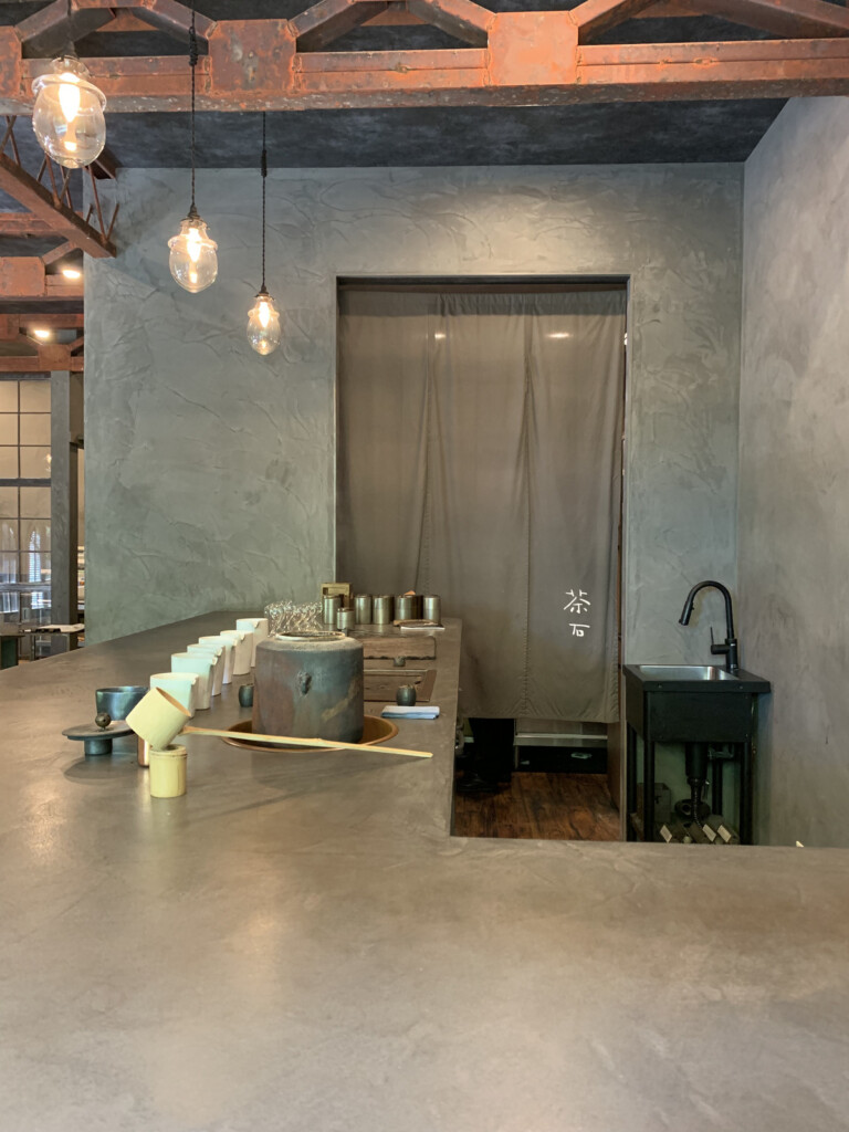 レトロな外観から雰囲気を変え、店内はカウンターを中心としたモダンな雰囲気。目の前に茶釜や急須などの茶道具が並び、静かな時間が流れます。