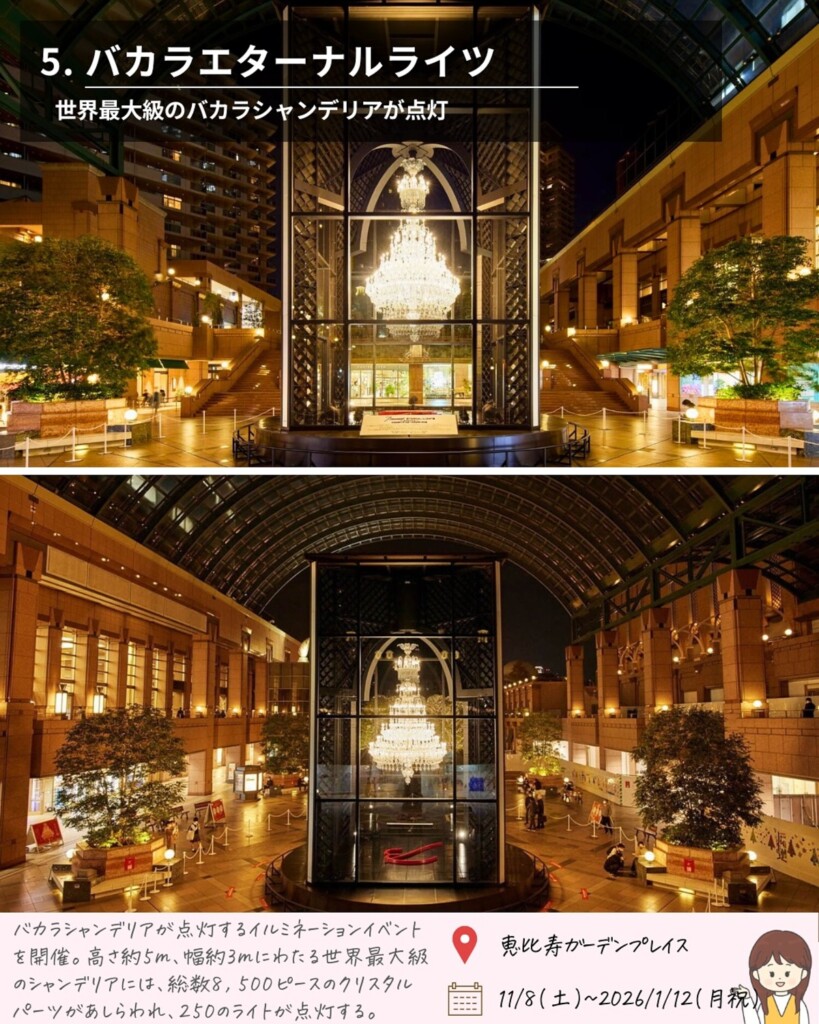 恵比寿ガーデンプレイスのイルミネーションイベントは、世界最大級のバカラシャンデリアが主役。