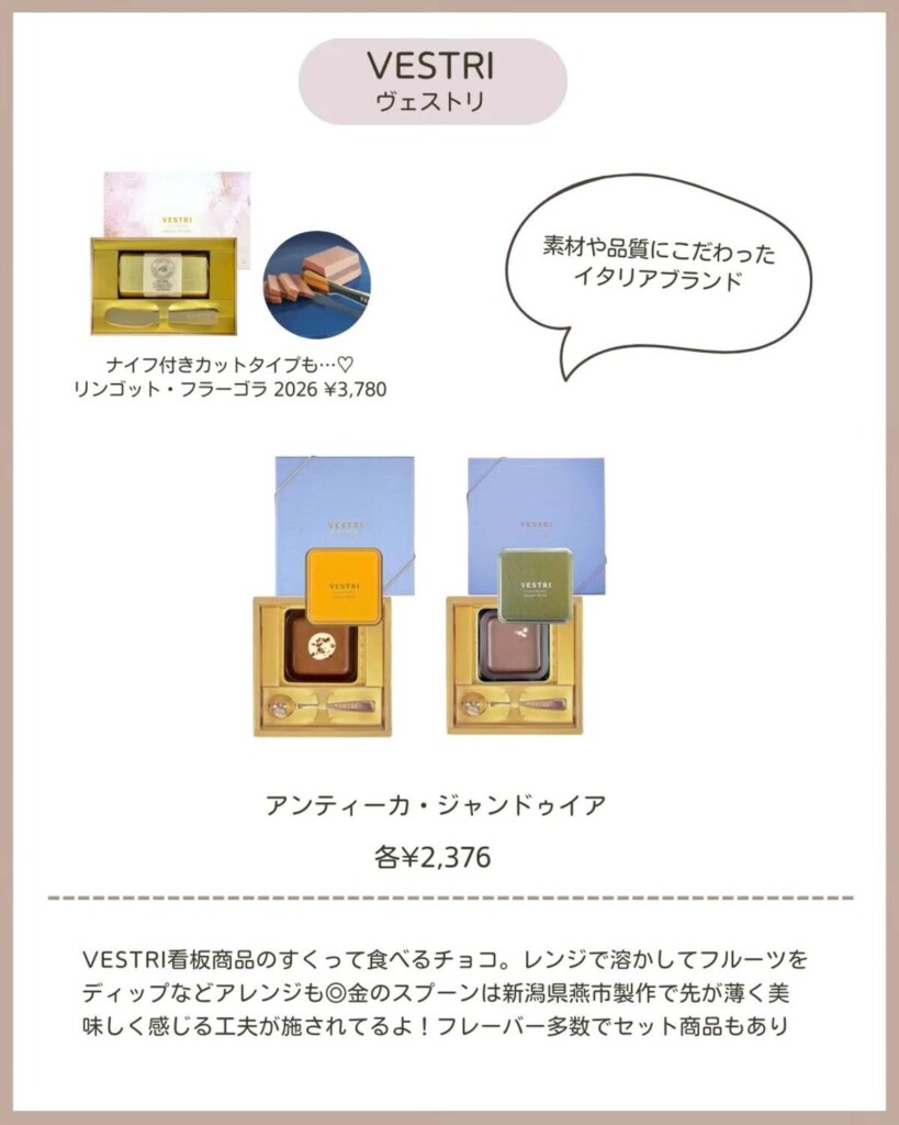 イタリアのブランド、VESTRI(ヴェストリ)ではスプーンですくって食べるチョコ「アンティーカ・ジャンドゥイア」が人気。カラフルな缶に金のスプーンがついており、濃厚で滑らかなチョコレートを堪能できます。フレーバーも種類豊富で、見た目でも味でも満足してもらえそうな一品です。