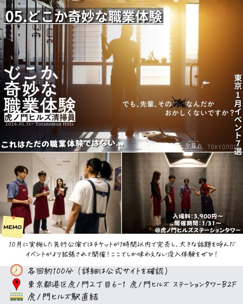 こちらはそんな職業体験をテーマに、とある物語の登場人物になれるイベントです。虎ノ門ヒルズステーションタワーを舞台に、清掃員として謎を解いていく珍しい体験。探検や謎解きが好きな人におすすめです。