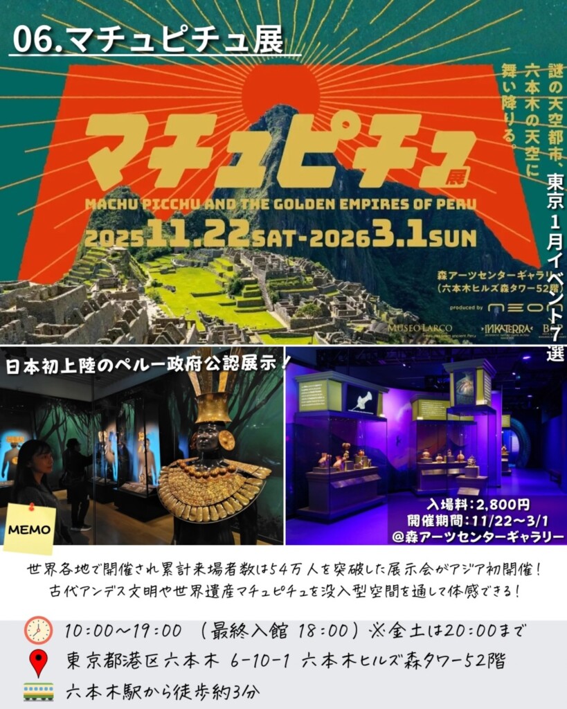 森アーツセンターギャラリーで開催される「マチュピチュ展」は、天空都市マチュピチュとインカ帝国の謎に迫る珍しい展示です。