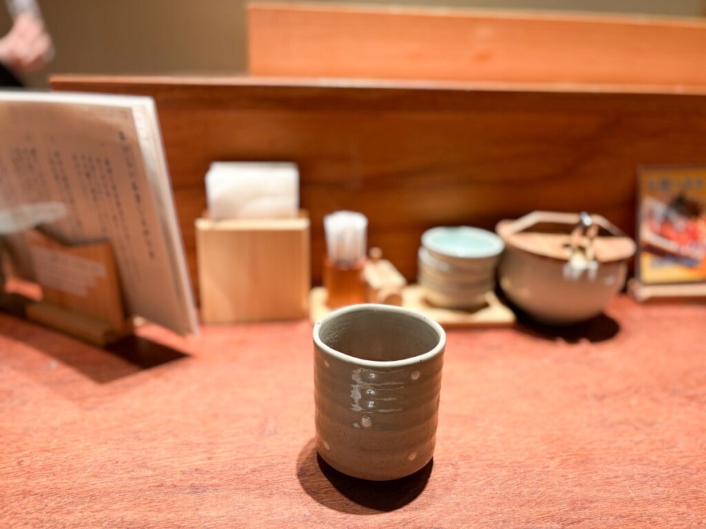 カウンター席に案内され、温かいお茶とメニューをもらいました。