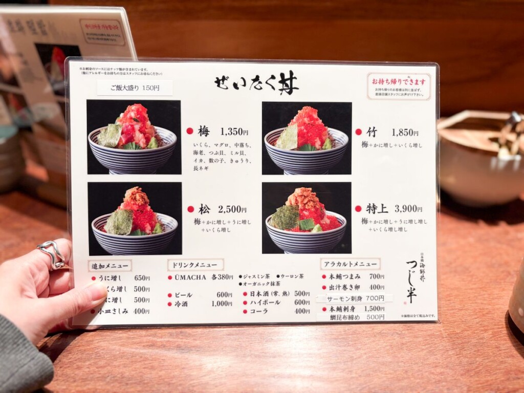 メニューは4種類で、「梅」「竹」「松」「特上」から選ぶことができます。 一番ベーシックな「梅」は、いくら・マグロ・中落ち・海老・つぶ貝・ミル貝・イカ・数の子・きゅうり・長ネギがたっぷりトッピングされたメニュー。