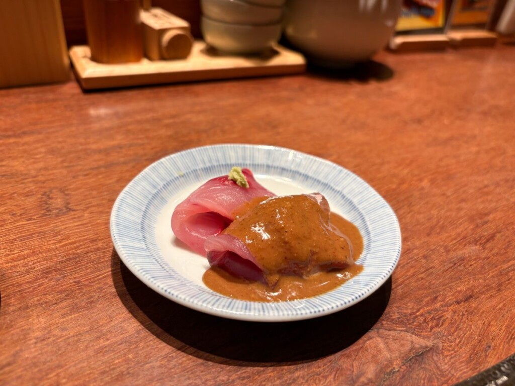 オーダーして少し待つと、まずはお刺身が登場!たれに絡めて食べるととても美味しい…! 4切れ入ってるのですが、半分は最後の出汁と一緒に楽しむために残しておくことをおすすめします。