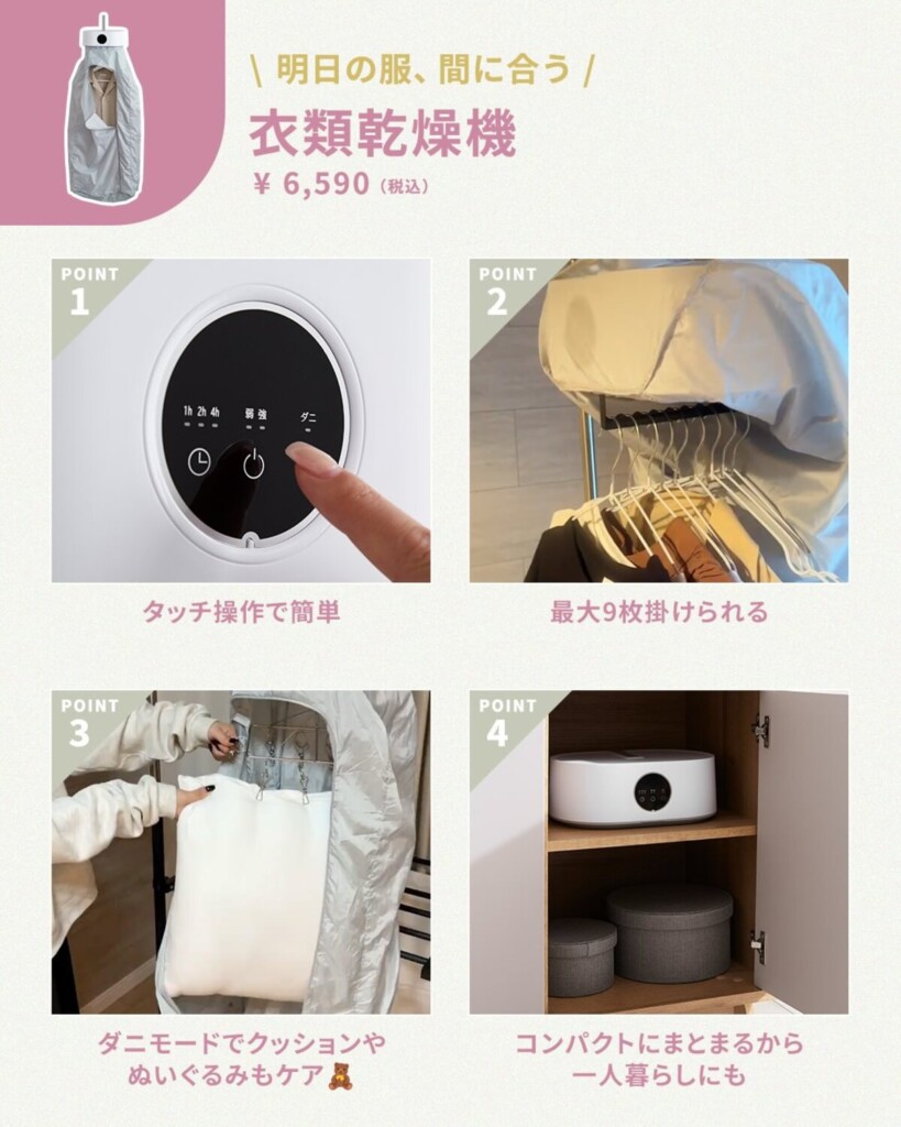 SNSで話題になった衣類乾燥機は、部屋干しでもサッと洗濯物が乾かせる優れモノ。