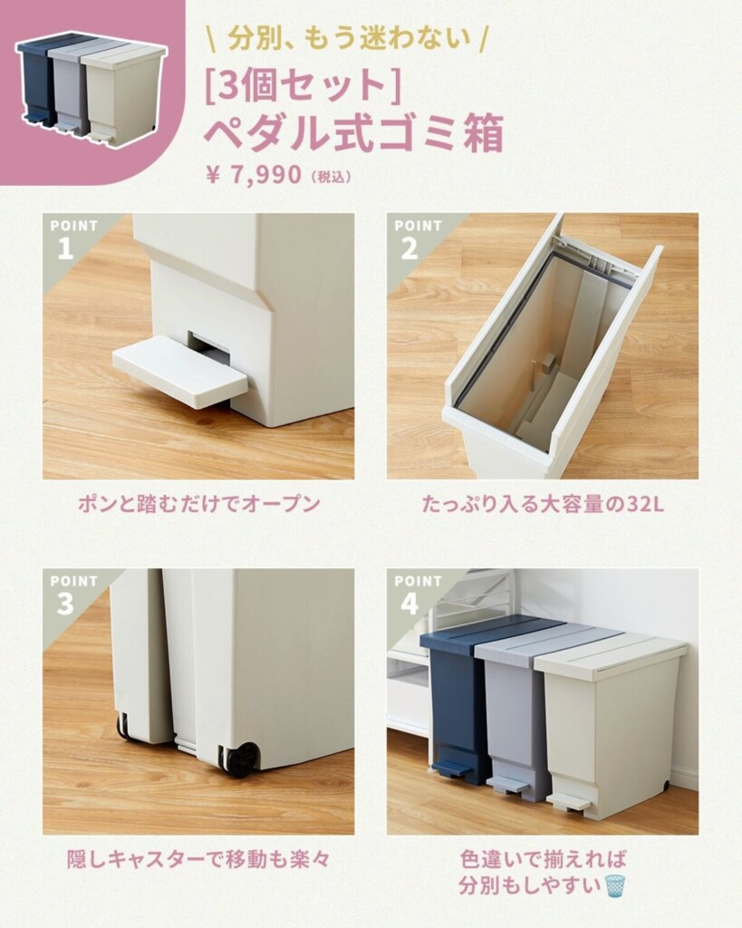 こちらのアイテムは、3個セットで分別をしたり複数の部屋に置いたりするのに便利です。