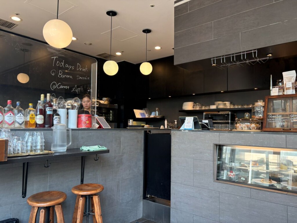 店内席は、ガラス張りのテラスから自然光が差し込む温かみのある落ち着いた雰囲気。グレーの壁が空間のアクセントになっています。