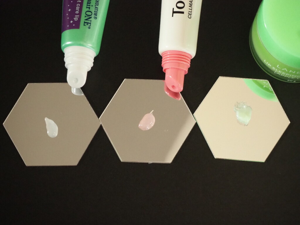 まずはリップケアグッズから、3種類を比較します。画像左から、アイテム名と価格をご紹介しましょう。