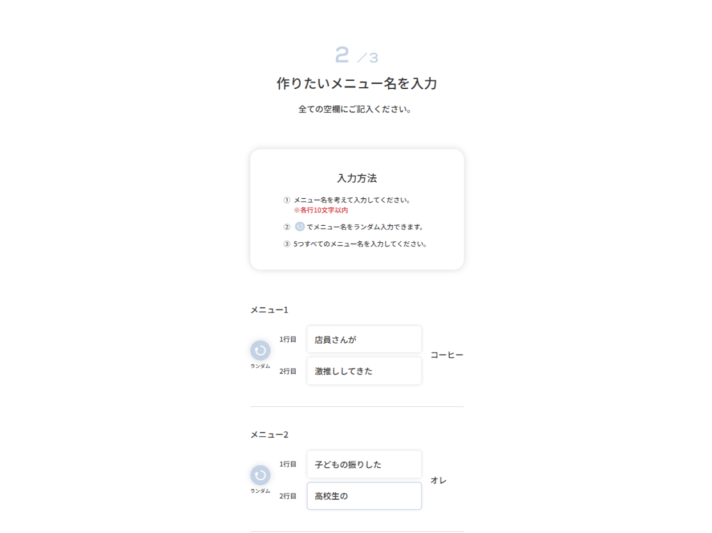 メニュー名は「10文字以内×2行以内」。1行だけでも大丈夫ですし、迷ったらランダムボタンもあります。