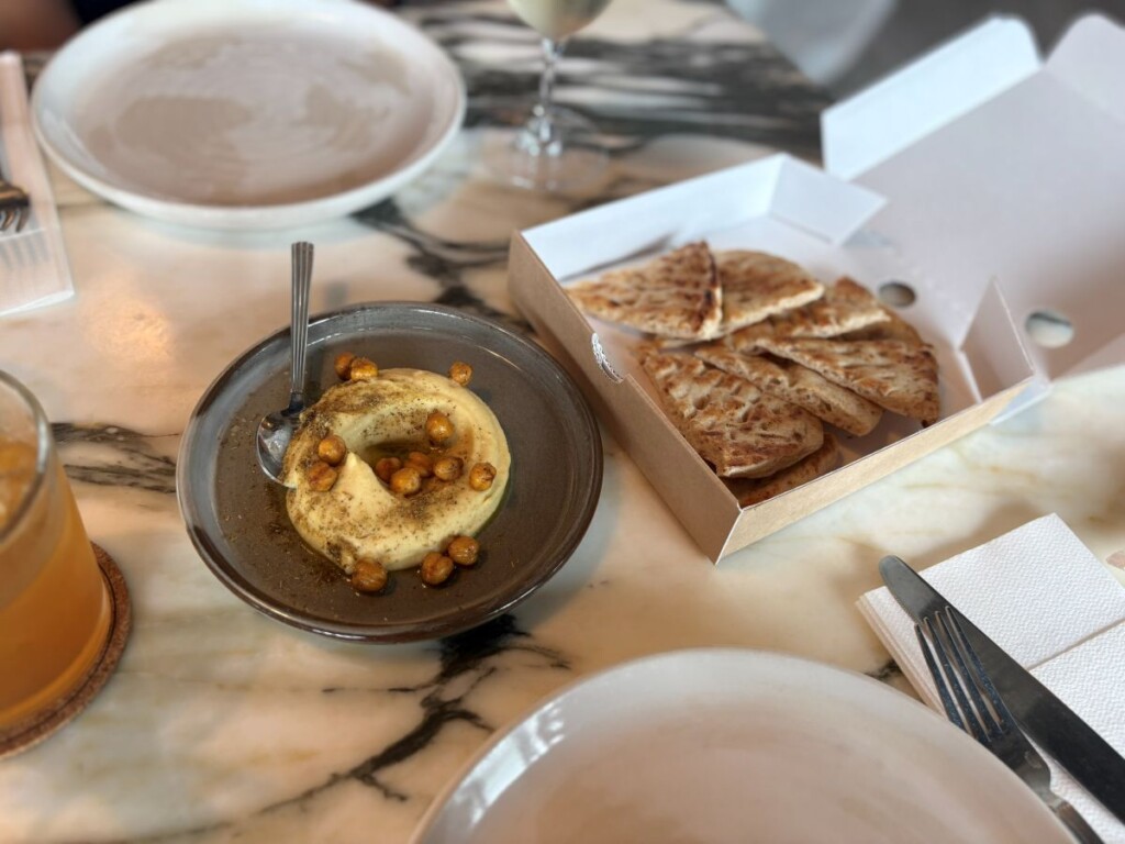前菜はピタブレッド。イエローエンドウ豆の濃厚なソースをディップしていただくスタイルです。ピタブレッドは、ピザ容器のようなパッケージに入っていました。