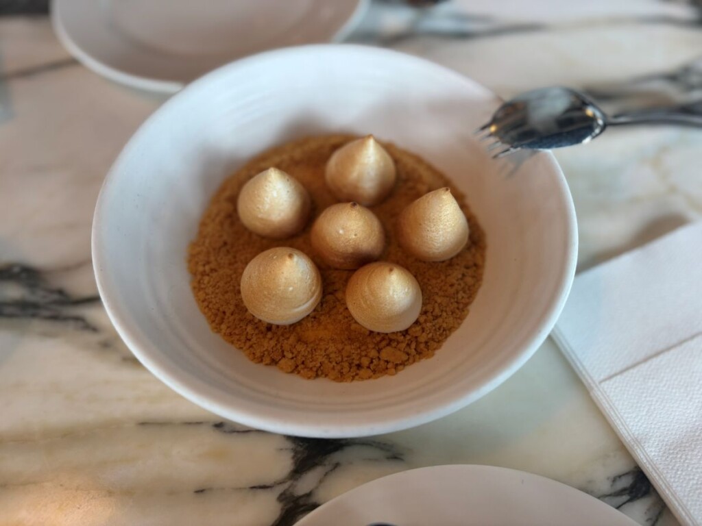 甘酸っぱいレモンカードの上に、ギリシャ産のオリーブオイルで作ったさくさくのクランブルと、さっとあぶった滑らかなメレンゲを乗せた人気のデザートです。